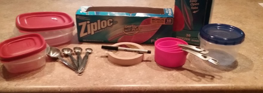 Measuring cups/spoons-If you’re only doing a few meals one set will work fine. I typically use three sets when I do 10+ meals. It saves a lot of washing time. I also use a large glass measuring cup and a large plastic measuring cup.